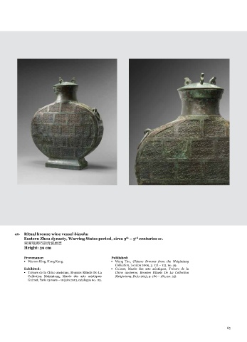 ▪ Arts of Ancient China, March 27 to April 12, 2006, Collection, London 2009, p. 108-111, no. 48. ▪ Trésors de la Chine ancienne, Bronzes Rituels De La Chine ancienne, Bronzes Rituels De La Collection