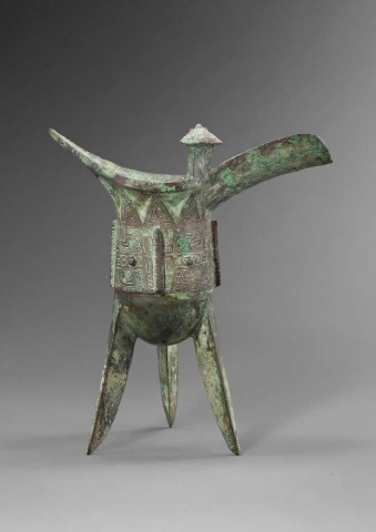 An archaic bronze wine vessel jue supported by three triangular outwardly