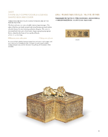 YONGZHENG INCISED FOUR-CHARACTER MARK AND OF THE 一件相似的鎏金銅方勝式盒,2022年11月29日,拍品3068號。