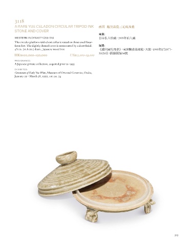 A RARE YUE CELADON CIRCULAR TRIPOD INK 西晉 越窯青瓷三足硯及蓋