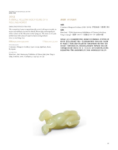 HK$150,000-250,000 US$20,000-32,000 膩光潤、玉質上乘的黃玉,雕出一匹活潑生動的駿馬。馬前足曲卧,後足翻