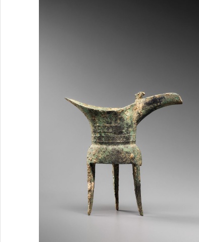 Archaic bronze wine vessel jue supported on three thinly cast trian-