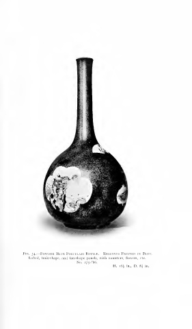 Fic. 34. — Powder Blue Porcelain Bottle. Reserves Painted in Blue. Lobed, fruit-shape, and fan-shape panels, with monsters, flowers, etc. No. 275-'86. H. 16J in., D. &i in.