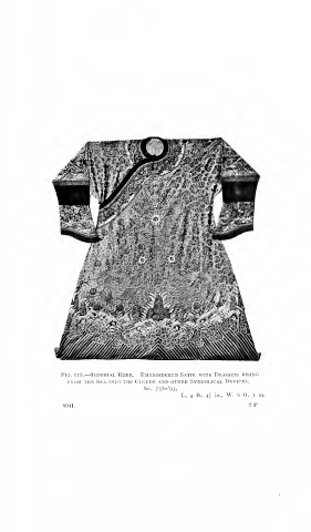 Fig. ii8.— Imperial Robe. Embroidered Satin with Dragons rising FROM THE Sea into the Clouds and other Symbolical Devices. No. 758-93. L. 4 ft. 4^ in., VV. 6 ft. I m. 2P 8941.