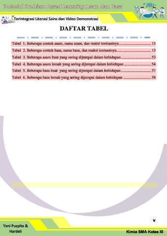 Tabel 1. Beberapa contoh asam, nama asam, dan reaksi ionisasinya ................................ 13