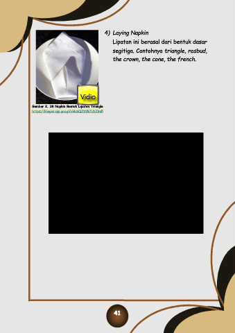 4) Laying Napkin Lipatan ini berasal dari bentuk dasar segitiga. Contohnya triangle, rosbud, the crown, the cone, the french. Gambar 2. 38 Napkin Bentuk Lipatan Triangle https://images.app.goo.gl/ohkziQZtXR7U3Z9u5 41