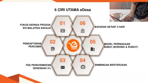 6 CIRI UTAMA eDesa 01 06 FOKUS KEPADA PRODUK IKS MALAYSIA SAHAJA BAYARAN SETIAP 3 HARI 02 05 PENDAFTARAN MODEL PERNIAGAAN PERCUMA. B2B2C (BORONG & RUNCIT) 03 04 FEE PERKHIDMATAN BIMBINGAN BERTERUSAN SERENDAH 3%