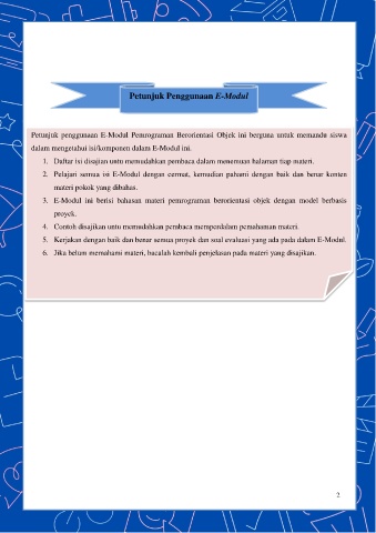 Petunjuk penggunaan E-Modul Pemrograman Berorientasi Objek ini berguna untuk memandu siswa