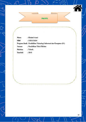 PROFIL Nama : Khairul Azmi NIM : 5183151034 Program Studi : Pendidikan Teknologi Informasi dan Komputer (S1) Jurusan : Pendidikan Tekni Elektro Fakultas : Teknik Stambuk : 2018 23