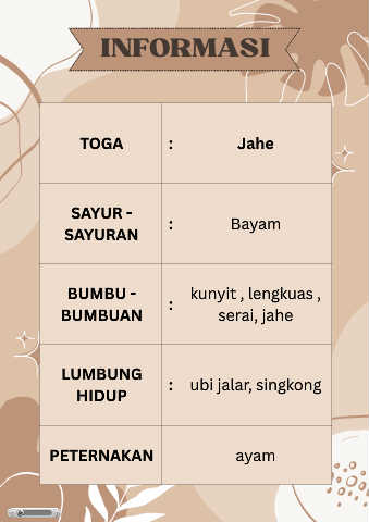 INFORMASI TOGA : Jahe SAYUR - SAYURAN : Bayam BUMBU - kunyit , lengkuas , BUMBUAN : serai, jahe LUMBUNG : ubi jalar, singkong HIDUP PETERNAKAN ayam