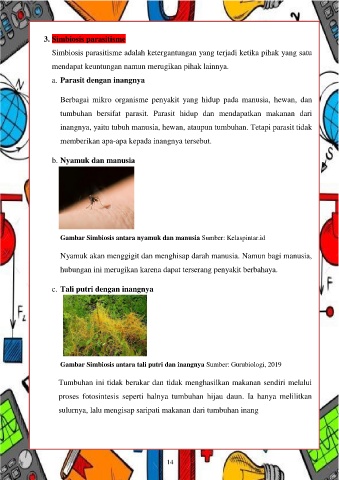 inangnya, yaitu tubuh manusia, hewan, ataupun tumbuhan. Tetapi parasit tidak