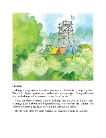 lashing, square lashing, and diagonal lashing. Start and end the lashings with