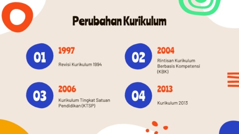 Perubahan Kurikulum 01 1997 02 2004 Rintisan Kurikulum Revisi Kurikulum 1994 Berbasis Kompetensi (KBK) 03 2006 04 2013 Kurikulum Tingkat Satuan Pendidikan (KTSP) Kurikulum 2013