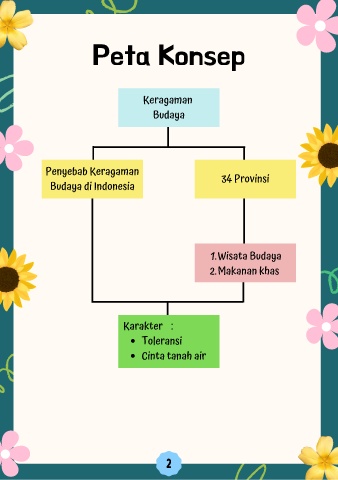 Peta Konsep Keragaman Budaya Penyebab Keragaman 34 Provinsi Budaya di Indonesia 1. Wisata Budaya 2. Makanan khas Karakter : Toleransi Cinta tanah air 2