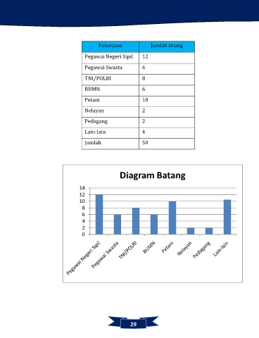 Pekerjaan Jumlah Orang Pegawai Negeri Sipil 12 Pegawai Swasta 6 TNI/POLRI 8 BUMN 6 Petani 10 Nelayan 2 Pedagang 2 Lain-lain 4 jumlah 50 Diagram Batang 14 12 10 8 6 4 2 0 29