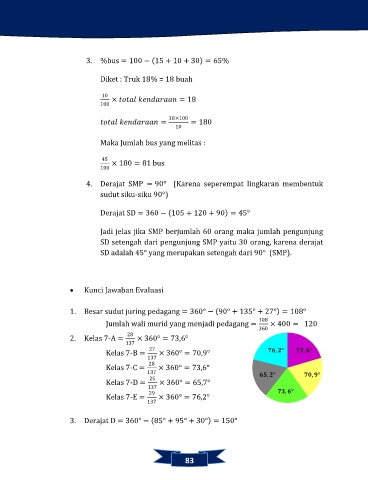 1. Besar sudut juring pedagang = 360° − 90° + 135° + 27° = 108°