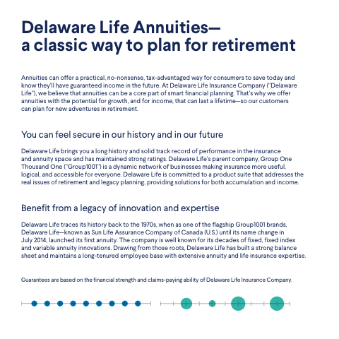 and annuity space and has maintained strong ratings. Delaware Life’s parent company, Group One Thousand One (“Group1001”) is a dynamic network of businesses making insurance more useful, logical, and accessible for everyone. Delaware Life is committed to a product suite that addresses the real issues of retirement and legacy planning, providing solutions for both accumulation and income.