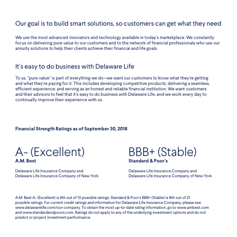 To us, “pure value” is part of everything we do—we want our customers to know what they’re getting and what they’re paying for it. This includes developing competitive products; delivering a seamless, ef cient experience; and serving as an honest and reliable nancial institution. We want customers and their advisors to feel that it’s easy to do business with Delaware Life, and we work every day to continually improve their experience with us.