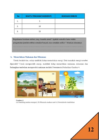 (a) Kambing makan rumput; (b) Manusia makan nasi (c) fotosintesis tumbuhan