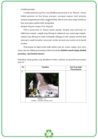 danau, dan laut. Bahan pencemaran air bisa berasal dari limbah rumah tangga, limbah
