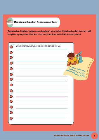 Mengkomunikasikan Pengetahuan Baru Berdasarkan langkah kegiatan pembelajaran yang telah dilakukan,buatlah laporan hasil penyidikan yang telah dilakukan dan menyimpulkan hasil diskusi kelompokmu! e-LKPD Berbasis Model Guided Inquiry 6