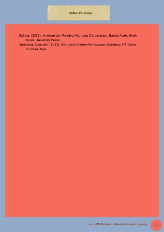 Daftar Pustaka Safrida. (2018). Anatomi dan Fisiologi Manusia. Darussalam, Banda Aceh: Syiah Kuala University Press. Surtiretna, Nina dkk. (2013). Mengenal Sistem Pernapasan. Bandung: PT Dunia Pustaka Jaya. e-LKPD Berbasis Model Guided Inquiry 16