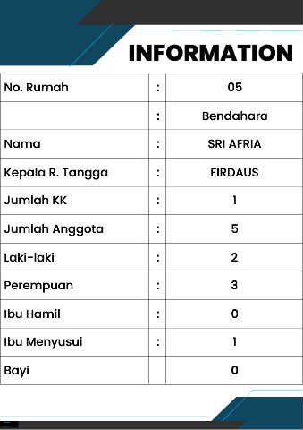 INFORMATION No. Rumah : 05 : Bendahara Nama : SRI AFRIA Kepala R. Tangga : FIRDAUS Jumlah KK : 1 Jumlah Anggota : 5 Laki-laki : 2 Perempuan : 3 Ibu Hamil : 0 Ibu Menyusui : 1 Bayi 0