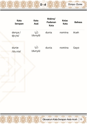 D - d Donya - Dunie Makna/ Kata Kata Kelas Serapan Asal Padanan Kata Bahasa Kata donya / ﺎﻴْﻧُد dunia nomina Aceh َ ɖo.ɲa/ (dunyā) dunie ﺎﻴْﻧُد dunia nomina Gayo َ /du.niə/ (dunyā) Glosarium Kata Serapan Arab-Aceh 11