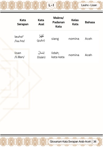 L - l Leuho - Lisan Makna/ Kata Kata Kelas Serapan Asal Padanan Kata Bahasa Kata leuho² ٌﺮ ْ ﻬ ُ ﻇ siang nomina Aceh /lɯ.ho/ (ẓuhr) lisan ٌنﺎ َ ﺴِﻟ lidah; /li.θan/ (lisān) kata-kata nomina Aceh Glosarium Kata Serapan Arab-Aceh 36
