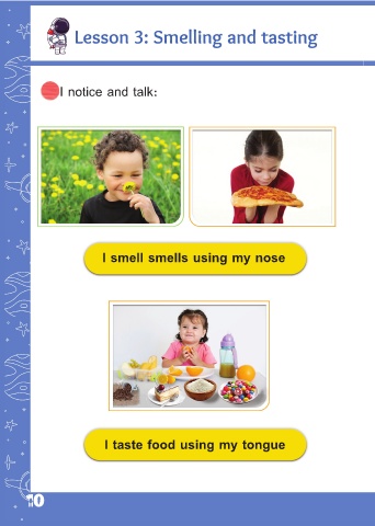 I notice and talk: I smell smells using my nose I taste food using my tongue 10
