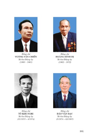 Đồng chí Đồng chí VƯƠNG VĂN CHIẾN HOÀNG ĐÌNH DỊ Bí thư Đảng ủy Bí thư Đảng ủy (1960 - 1961) (1962 - 1972) Đồng chí Đồng chí TÔ KIM NGHI ĐÀO VĂN ĐẠC Bí thư Đảng ủy Bí thư Đảng ủy (01/1973 - 4/1974) (5/1974 - 02/1987) 301