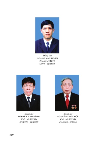 Đồng chí HOÀNG VĂN HOÀN Chủ tịch UBND (1993 - 12/1999) Đồng chí Đồng chí NGUYỄN ANH DŨNG NGUYỄN TRÚC ĐỨC Chủ tịch UBND Chủ tịch UBND (01/2000 - 12/2002) (01/2003 - 5/2004) 310