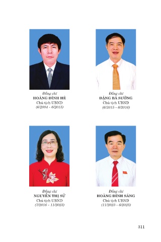 Đồng chí Đồng chí HOÀNG ĐÌNH HÈ ĐẶNG BÁ SƯỚNG Chủ tịch UBND Chủ tịch UBND (6/2004 - 6/2015) (6/2015 - 6/2016) Đồng chí Đồng chí NGUYỄN THỊ SỬ HOÀNG ĐÌNH SÁNG Chủ tịch UBND Chủ tịch UBND (7/2016 - 11/2023) (11/2023 - 6/2025) 311