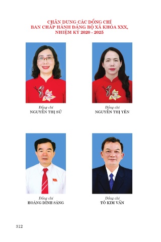 CHÂN DUNG CÁC ĐỒNG CHÍ BAN CHẤP HÀNH ĐẢNG BỘ XÃ KHÓA XXX, NHIỆM KỲ 2020 - 2025 Đồng chí Đồng chí NGUYỄN THỊ SỬ NGUYỄN THỊ YÊN Đồng chí Đồng chí Đồng chí HOÀNG ĐÌNH SÁNG TÔ KIM VẤN ĐẶNG BÁ HIỆP 312