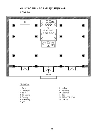 VII. SƠ ĐỒ PHÂN BỐ TÀI LIỆU, HIỆN VẬT: 1. Nhà thờ: Chú thích: 1. Đại tự 8. Lọ hoa 2. Long ngai 9. Hạc đồng 3. Bài vị 10. Hóa trầm 4. Bát hương 11. Đèn 5. Cọc sáp 12. Di ảnh Trần Phú 6. Mâm bồng 13. Linh xa 7. Quả 44