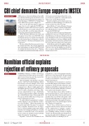 Simeon Negumbo, the ministry’s executive director, told New Era that Namibian o cials had already reviewed multiple offers from potential investors. At the low end, he said, some companies have o ered to build a plant with a throughput capacity of about 25,000 barrels per day for as little as NAD4bn ($263.6mn). Oth- ers have submitted bids of up to NAD120bn ($7.9bn) for larger facilities capable of handling up to 100,000 bpd, he said. So far, though, all of these proposals have fallen short of the govern- ment’s requirements, he stated.