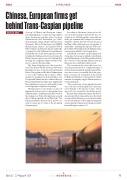 A group of Chinese and European compa- nies allegedly plans to realise the long-delayed Trans-Caspian gas pipeline project between Turkmenistan and Azerbaijan, pro-Turk- men media has claimed. Representatives from Germany’s Edison Technologies and MMEC Mannesmann, France’s Air Liquide Global E&C Solutions and China’s Sinopec held talks on August 13 with Turkmen Foreign Minister Rashid Meredov at the rst Caspian economic forum in the Turkmen tourist zone of Avaza, the Orient.tm news agency reported. During their meeting, the companies expressed their readi- ness to construct the subsea pipe.
