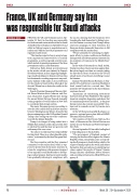 FrANCe, the UK and germany said on Sep- tember 23 that it is clear Iran was responsible for the drone and cruise missile strikes on Saudi oil facilities that took place on September 14 and called on Tehran to agree to negotiations on its nuclear and ballistic missile programmes and regional security issues.