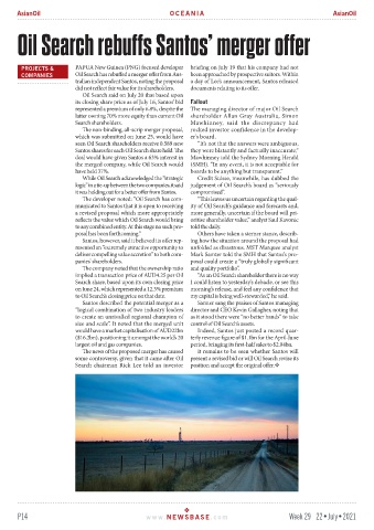 COMPANIES Oil Search has rebuffed a merger offer from Aus- been approached by prospective suitors. Within