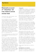 In a televised prime-time speech from Israel’s military headquarters in Tel Aviv, Netanyahu claimed Israeli agents had obtained half a tonne of documents from what he called Iran’s “Atomic Archives”. But Olli Heinonen, former chief inspec- tor of the International Atomic Energy Agency (IAEA), was quoted by the Guardian as saying his department first saw documentation that Netan- yahu presented as new back in 2005. The safe- guards department that Heinonen ran concluded that the evidence of Iranian nuclear weapon design work known as the Amad Project was credible, but that substantial work on the project ended in 2003. A classified briefing on Amad was given to the IAEA board in 2008.