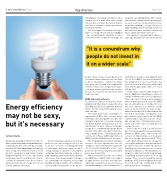 A factor that helps explain its lack of ap- peal is the fact that energy efficiency is not a concrete – or novel – technology like wind or solar power, but rather a goal to reduce energy wastage on both the consumption and production sides in industry, residences, public buildings, power generation and many other areas. Few energy saving technologies are cutting edge; the majority, such as tight building envelopes and fuel-efficient boilers, are tried and tested solutions. So the practice