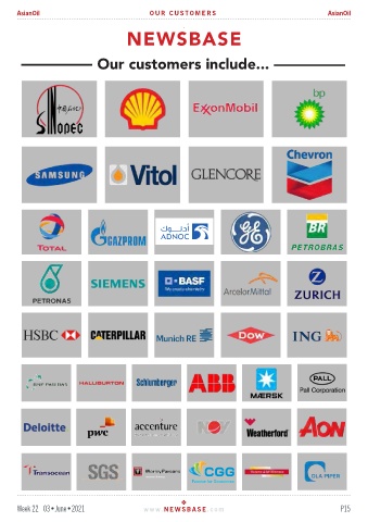 v AsianOil OUR CUSTOMERS AsianOil NEWSBASE Our customers include... If you are interested in your company’s logo appearing on this page, please contact your Customer Week 22 03•June•2021 Accounts Manager on +44 131 478 7000. P15 www. NEWSBASE .com