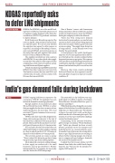 Commenting on the extended lockdown, global energy consultancy Wood Mackenzie said: “India’s gas demand has been severely affected, primarily across the transport and industrial sectors. As a notoriously price-sensi- tive market, low oil prices are also a competitive threat to gas. High inventories are resulting in refiners further reducing margins for oil prod- ucts to compete with gas, leading to downside risk on the LNG demand outlook.”