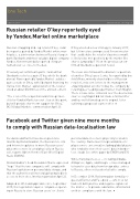 Adopted in 2014 and applicable since September 2015, this legislation requires companies operat- ing in Russia to store Russian users’ or clients’
