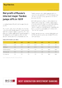 The results came in at 2-3% above the Interfax consensus, BCS Global Markets commented on April 25 seeing the update as positive. The com- pany also slightly upgraded the growth guidance, including for search segment, while the taxi division continued to hover around break even.