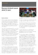 The state-owned companies are playing an in- creasingly important role in Russia’s dividend payout story. In addition to raising taxes on the biggest honey pot, mostly raw material producers, the cash-strapped government has demanded that they pay out 50% of their earnings as divi- dends. The Ministry of Finance has been trying to enforce the rule, but many of the biggest compa- nies, such as Rosneft, had begged off, claiming their heavy investment programmes make this impossible. However, several of the most impor- tant companies have been coughing up – the retail banking giant Sberbank first among them.