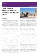 of the attention has been on the current ruling regime’s reform drive, culminating in the coun- try’s smash hit sovereign bond debut this month. That interest has now turned into a flood of trips by leading companies to explore the opportunities on offer in Central Asia’s most populous country and, as the only one of the five ’Stans to share a border with all the others, the region’s natural production base. Executives are arriving in Tash- kent to see how serious the Central Asian nation’s efforts to open the country really are.