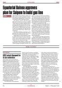 the ministry said last week that it had approved the award of a contract to Saipem (Italy) for the construction of a pipeline that will connect offshore gas fields to the petrochemi- cal complex that is being built at Punto Europa. Saipem will be building the link for a joint ven- ture operated by Noble Energy (US) along a 70-km route originating at the Alen Unit site, which straddles Blocks O and I offshore Equa- torial Guinea.