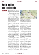 Jordan’s public nances have su ered badly since the cessation of cheap gas imports from Egypt in 2011, forcing reversion to costly imports of liquid fuel to re power stations. is situation was eased in January, though, as Cairo resumed exports said by the two governments to be su - cient to cover around 50% of Jordanian electric- ity generation requirements. e proposed Iraq pipeline would include a spur carrying 150,000 bpd to Jordan’s re nery at Zarqa, which is in the process of a much-delayed expansion.