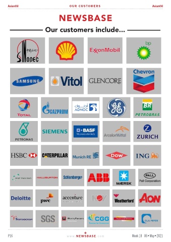 v AsianOil OUR CUSTOMERS AsianOil NEWSBASE Our customers include... If you are interested in your company’s logo appearing on this page, please contact your Customer P16 Accounts Manager on +44 131 478 7000. Week 18 06•May•2021 www. NEWSBASE .com
